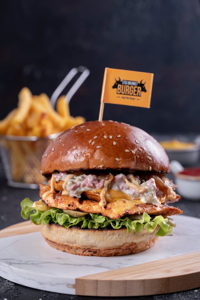Trüf Mayonezli Chicken Burger (Yeni) İçindekiler:Özel Soslar ile Marine Edilmiş Izgara Tavuk, Trüflü Mayonez, Çıtır Soğan Parçacıkları, Peynir ve Patates Kızartması ile. Fiyat:120gr 349₺, 180gr 419₺